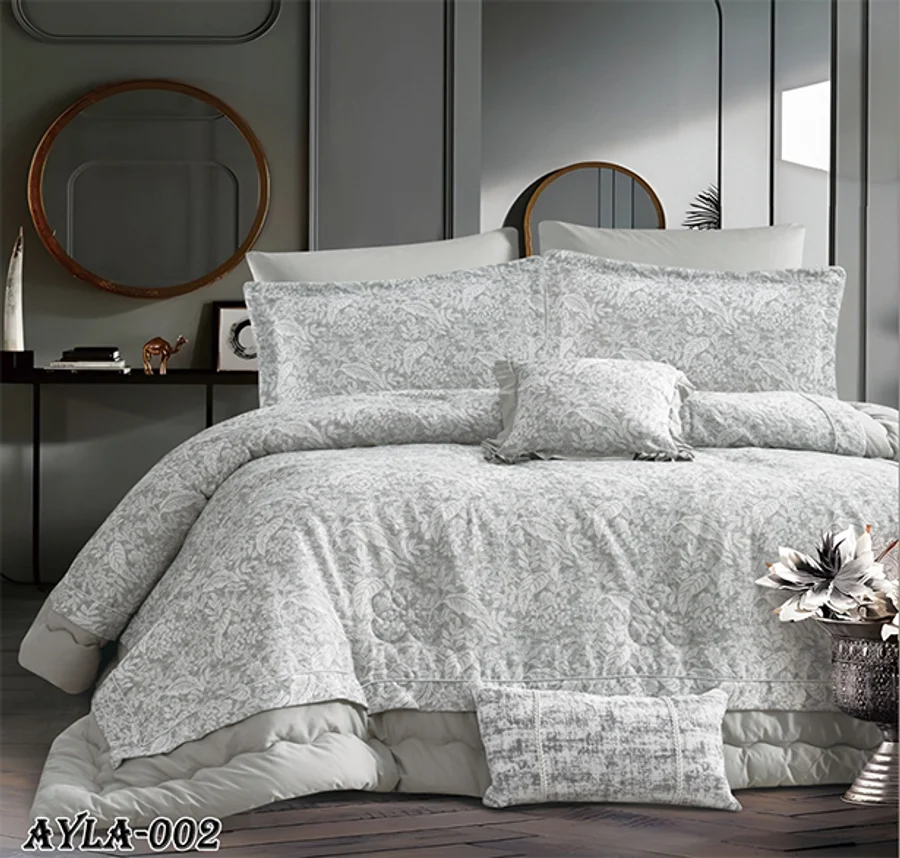 Luxury has a name: the renowned Feather Silk Ayla Quilt Set | This luxurious 8-piece set for two people features an elegant design and is made of 100% cotton (Ayla-01). Ideal for all seasons, especially cozy in summer, the set includes: a super king-size quilt with filling (260*240cm), a lace quilt cover (260*240cm), a fitted sheet (200*200+30cm), two embossed pillowcases (50*75+5cm), two pillowcases (50*75cm), and a decorative cushion (30-50cm) with embroidery. Care instructions: 1. Wash separately. 2. Do not bleach. 3. Do not tumble dry. 4. Iron at a maximum temperature of 30°C.